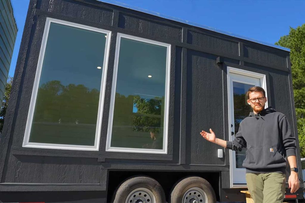 Ce qui surprend, c’est l’optimisation de l’espace. Contrairement à beaucoup de tiny houses qui misent sur des mezzanines, ici tout est sur un seul niveau. La pièce principale accueille un lit double, un petit coin salon modulable et une grande fenêtre panoramique qui inonde la pièce de lumière. De quoi éviter la sensation de « boîte à chaussures » souvent reprochée à ce type d’habitat. Côté cuisine, Dragon Tiny Homes a fait le choix de la simplicité élégante : plan de travail en quartz, meubles modernes, évier inox et suffisamment de rangements pour accueillir une plaque ou un petit four.